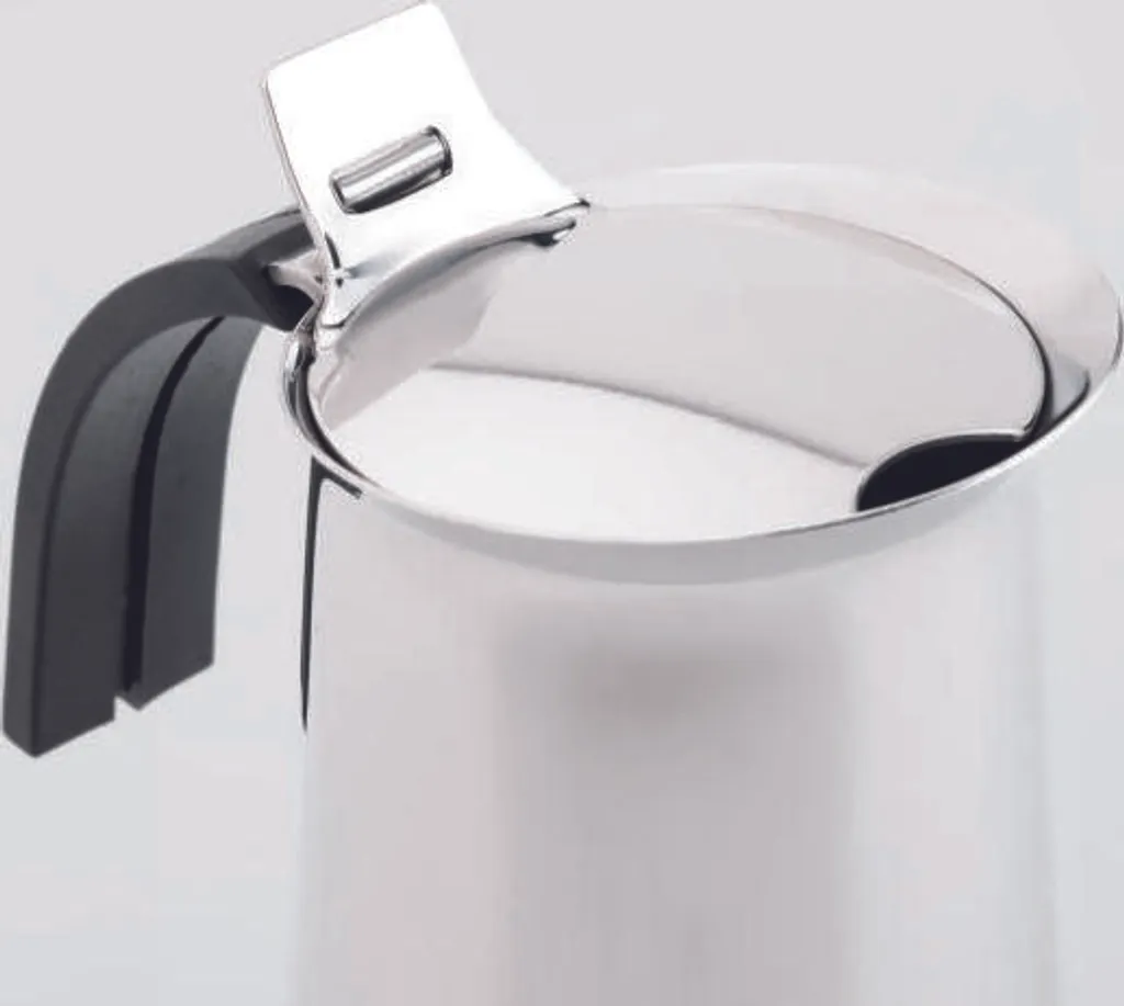 Der Edelstahlespressokocher in neuer Ausführung mit harmonischen, klassischen Linien und neuem Griff aus hitzebeständigem und weichem Kunststoff – eine Verführung
