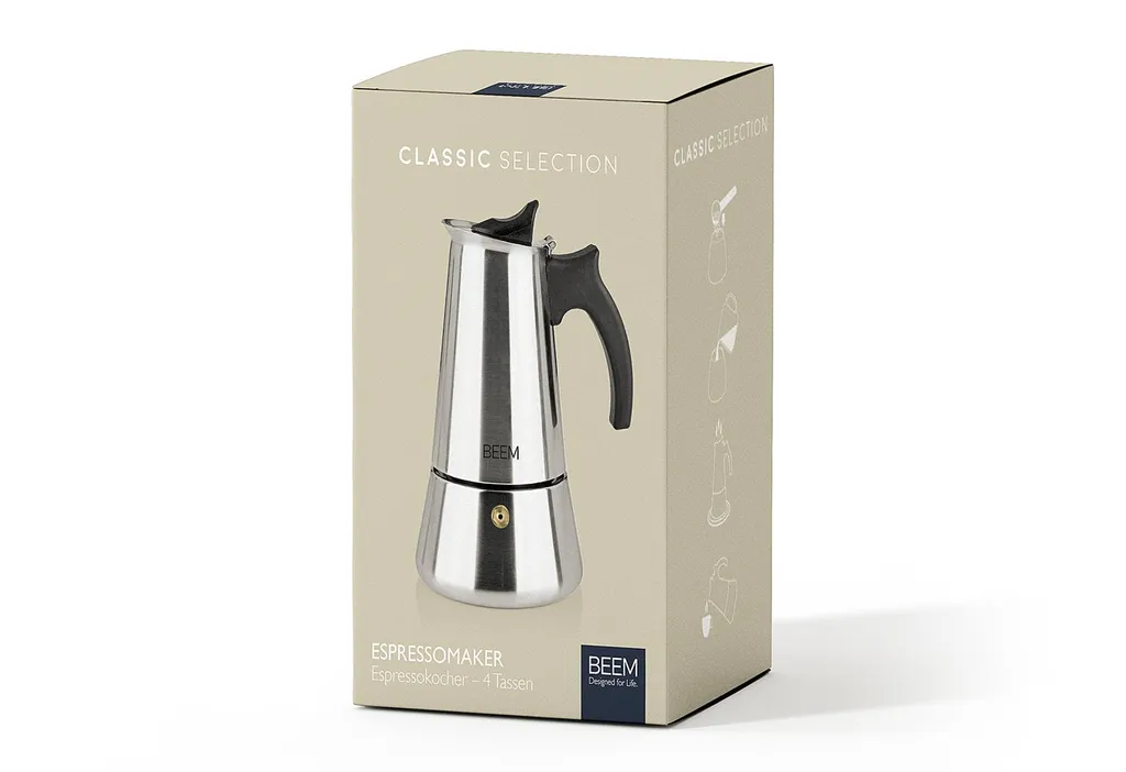 Bis zu 4 (Espresso-)Tassen (ca. 200 ml) lassen sich damit auf einmal zubereiten – genug für die kleine Kaffeepause am Nachmittag, das kreative Meeting im Büro oder für Espresso-Liebhaber, die zum Zelebrieren des Aromas gerne mehr als eine Tasse nehmen. Mit Sicherheitsventil, klassischem Aufbau und hitzebeständigem Griff bietet dir der BEEM ESPRESSOMAKER Espressokocher – 4 Tassen alle Features, die notwendig sind.