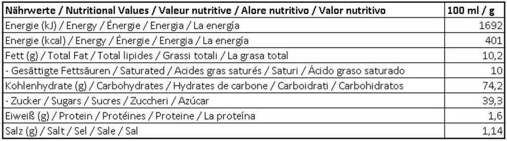 | Kohlenhydrate, davon Zucker in g | 39,300 | 0,000 | 0,00 |