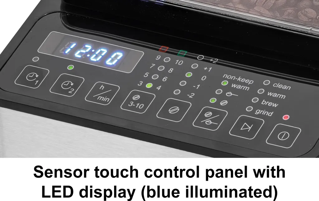 5-stufige Kaffeemehlvorwahl für 2–10 Tassen, um die Intensität des Kaffeegeschmacks zu variieren, Auch mit bereits gemahlenem Kaffeepulver verwendbar.