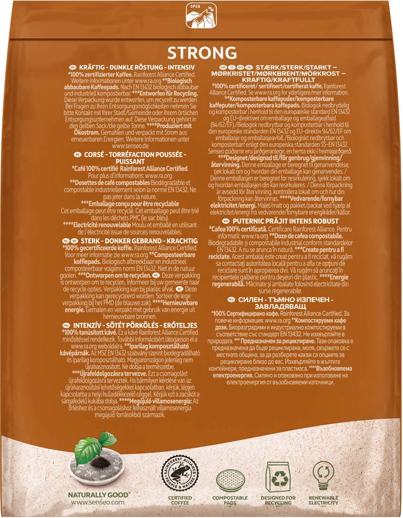 Strong: Ein vollmundiger, starker Kaffee aus dunkel gerösteten Arabica- und Robusta-Bohnen mit einer sanften Crema. In der praktischen Vorteilspackung.