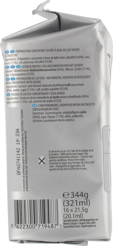 - Zutaten: Ultrafiltriertes VOLLMILCHKONZENTRAT (84%), Wasser, Zucker (7.5%), Salz, Säureregulator (E339)