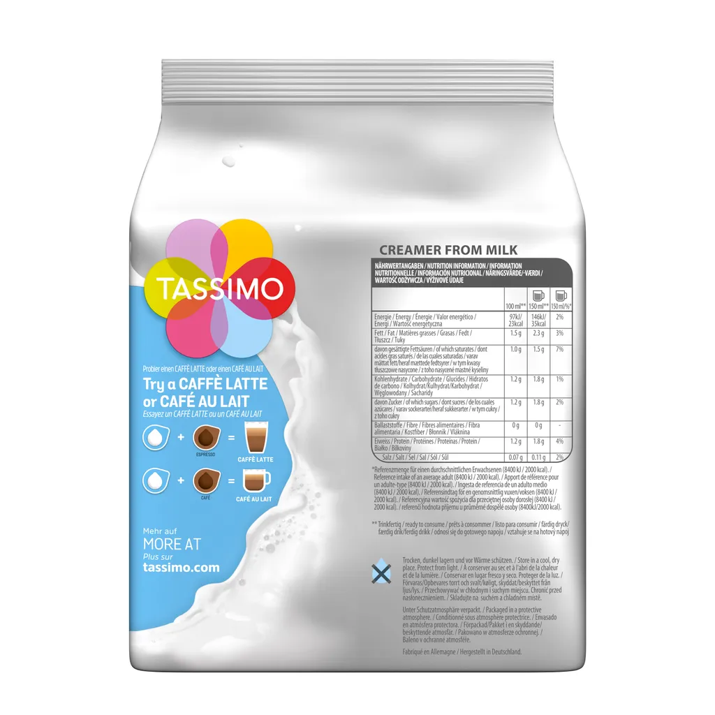 Cremiges VergnügenFür alle, die eine Tassimo-Kapselmaschine haben und Liebhaber einer Tasse Kaffee mit köstlich-cremigem Milchschaum sind, ist dies genau die richtige Wahl! Die TASSIMO Milchkomposition liefert Ihnen nämlich feinsten Milchschaum im Handumdrehen: Einfach Tassimo-Disc Kaffee einlegen, Knopf drücken und schon genießen Sie Ihre TASSIMO Milchkomposition aus ultrafiltriertem Vollmilchkonzentrat.Ein Pack enthält 16 Discs.Für Angaben gem. der Lebensmittelinformationsverordnung klicken Sie bitte hier.Nährwertinformationen pro 100gEnergie 176/42 kJ/kcalFett 2,8 gdavon gesättigte Fettsäuren 1,8 gdavon einfach ungesättigte Fettsäuren -davon mehrfach ungesättigte Fettsäuren -Kohlenhydrate 2,2 gdavon Zucker 2,2 gdavon mehrwertige Alkohole -davon Stärke -Ballaststoffe 0 gEiweiß 2,2 gSalz 0,20 gVitamine und Mineralstoffe –