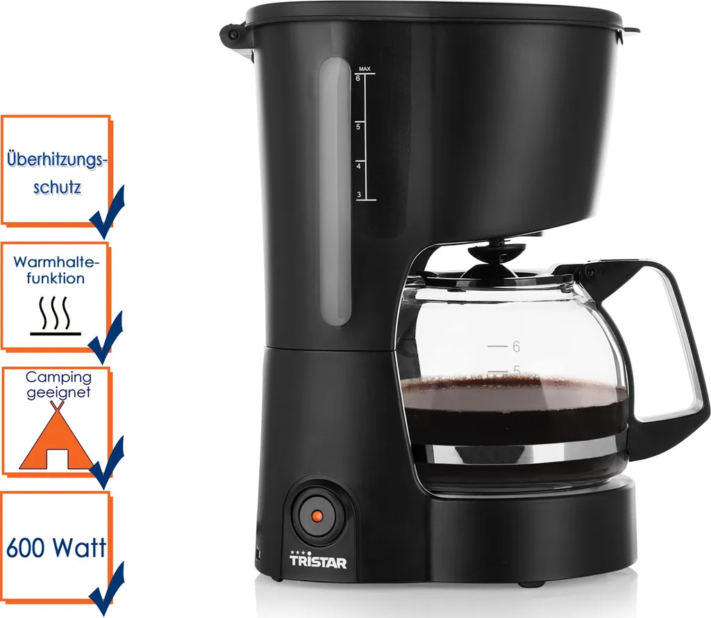 - Ausstattungen: Tropfstopp, Warmhalteplatte, Wasserstandsanzeige